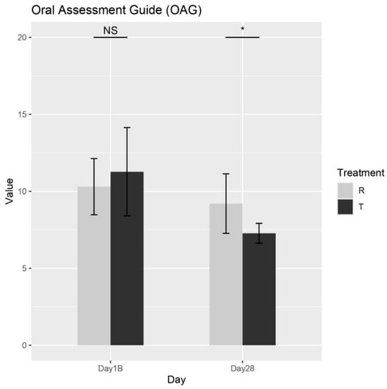 According to the Wilcoxon rank-sum test, a significant difference in the effects of Treatments R (placebo) and T (OROSOL) on the OAG score at Day 28 was observed, as shown in Figure 5. Specifically, Treatment T demonstrated a significantly greater reduction in symptoms compared to Treatment R at this time point. As anticipated, no significant differences were observed at baseline, which is expected since neither treatment had been administered prior to that time. These results strongly support the efficacy of Treatment T in alleviating oral mucositis symptoms in pediatric patients.