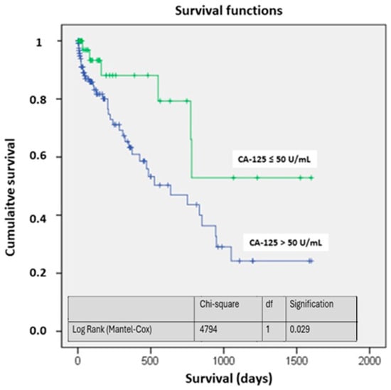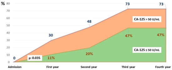 Survival analysis showed high mortality rates among these patients from admission and throughout the follow-up period of more than four years. The survival probability differed starting from the first month after hospitalization, with a significant trend towards higher mortality in the CA-125 > 50 U/mL group (0.07). After the first month, the differences were consistently significant (p < 0.05) (Table 6).