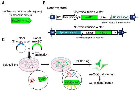 Transposon system for identifying genes encoding interacting proteins. (A). To induce BiFC (bimolecular fluorescence complementation), a fluorescent protein (in this case, mKG) is split into N- and C-terminal fragments. The N-terminal fragment is fused to the protein of interest (in this case, X) to generate the Bait strain. (B). Donor vectors are constructed to fuse the C-terminal fragment (mKGC) to endogenous genes. (C). Workflow: The donor vector and a helper vector encoding a transposase are co-transfected into the bait cell line. When an mKGC-fused protein interacts with the bait, the proximity of mKGC to mKGN leads to the reconstitution of mKG, resulting in fluorescence. This allows the isolation of cells in which the vector has been inserted into the gene encoding the interacting protein.