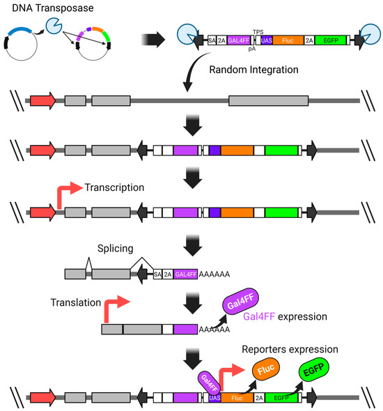 We overcame this issue by incorporating the GAL4FF-UAS system into the donor vector, which significantly enhanced the detection sensitivity. GAL4FF is a modified form of the yeast Gal4 transcription factor, consisting of a highly truncated DNA-binding domain and tandem repeats of a minimal transcription activation module derived from VP16 [116,117,120,121,122]. This engineered transcription factor enables robust and specific activation of UAS-linked reporter genes (Figure 3).