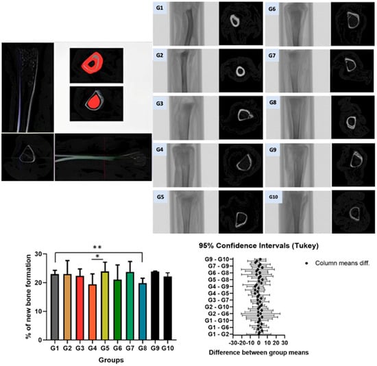 The percentage of newly formed bone assessed through micro-CT was first tested for normal distribution using the Kolmogorov–Smirnov test and for homogeneity of variances using Bartlett’s test. Following this, one-way ANOVA was applied, and differences between group means were examined with Tukey’s post hoc test. The statistical analyses were performed in GraphPad Prism (version 8.0, GraphPad® Software, La Jolla, CA, USA), adopting a significance threshold of 5%.