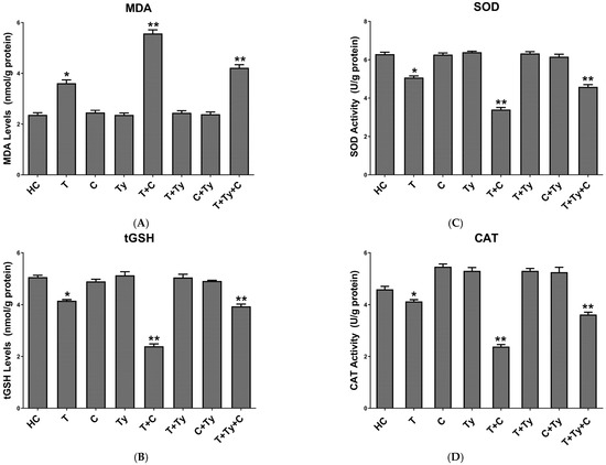 (A) MDA, (B) tGSH, (C) SOD, and (D) CAT levels of study groups. * p < 0.05 according to HC group; ** p < 0.0001 according to HC group. MDA: malondialdehyde; tGSH: total glutathione; SOD: superoxide dismutase; CAT: catalase; HC: healthy control; T: tramadol alone; C: citalopram alone; Ty: tianeptine alone; T + C: tramadol + citalopram; T + Ty: tramadol + tianeptine; C + Ty: citalopram + tianeptine; T + Ty + C: tramadol + tianeptine + citalopram.