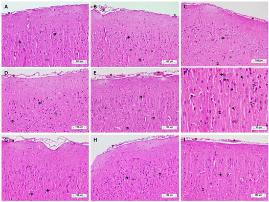 : microglia (A–D,G–I), increased microglia (E,F); ★: blood vessel (A,C,D,G,H), moderately dilated and congested blood vessel (B,I), severely dilated and congested blood vessel (E); ✹: apoptotic body (F).