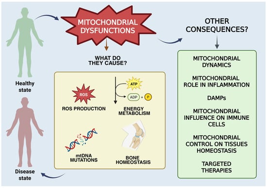 With reference to autoimmune diseases, rheumatoid arthritis (RA) is considered the most representative chronic inflammatory synovial disease, associated with the dysregulation of immune signalling pathways [1]. RA results in the stiffness and deformity of articular joints with inflammation of synovial tissues, neovascularization and autoantibody secretion, causing pain and difficulty in movement, increasing inconveniences to the patients’ health [2,3]. Currently, the aetiology is still unknown, and RA must be included among the possible factors that increase the risk of cardiovascular illness and connective tissue injuries, as well as compromising intestinal and oral health, causing many difficulties in the lifestyle and habits of affected patients [4]. The disease mainly affects people around 50 years old and affects women more than others, with a two-fold higher incidence [5]. RA is incurable nowadays and is often called “the cancer that never dies” for the peculiar characteristics of the disease like tissue destruction and erosion at the cartilage level, as well as the impairment of bone tissue. The disease also causes a percentage of disability in patients that is around 61.3%, which is quite high [6]. However, there are several approaches that can substantially reduce the pathological state and achieve drug-maintained remission [3]. Mitochondria act on several signalling pathways influencing immune cell activity, making this little organelle the heart of the activities that influence the emergence of diseases related to autoimmunity. A mitochondrial malfunction can result in mitochondrial DNA (mtDNA) mutations, abnormal increases in mitochondrial reactive oxygen species (ROS) and increased oxidative stress. Considering the numerous studies on the subject, it seems reasonable to affirm that mitochondrial malfunction or damage influence the pathogenesis and symptomatology of RA [1,7,8]. Its involvement goes beyond simple energy production, influencing several cellular processes, including immune response and inflammation processes [7]. This review will expose the main pathogenic pathways of RA. Then, we will focus on the theme underlying this work, which is understanding how mitochondrial functions act on the inflammatory processes related to RA, including a consideration of all mitochondrial dysfunction. Previous studies [9] highlight the main aspects of mitochondrial involvement in RA. However, this review provides an in-depth look at mitochondrial dynamics, DAMPs and mitochondrial metabolic activity that affects synovial cells, bone homeostasis and immunity. The aim is to provide a comprehensive view of mitochondrial involvement in RA (Figure 1). Finally, the main therapeutic pathways that aim to attenuate the symptoms and damages related to the dysfunction of mitochondria will be exposed.