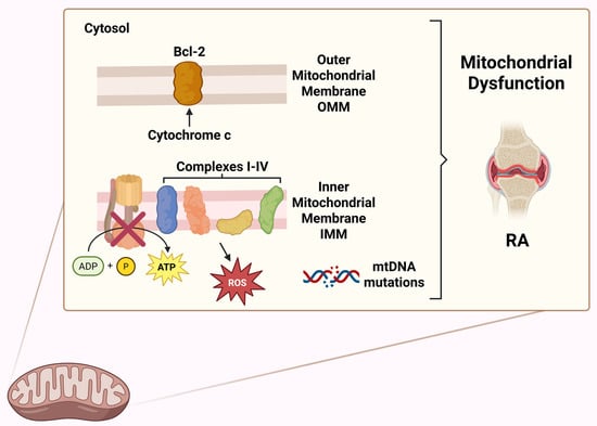 - López-Armada, M.J.; Fernández-Rodríguez, J.A.; Blanco, F.J. Mitochondrial Dysfunction and Oxidative Stress in Rheumatoid Arthritis. Antioxidants 2022, 11, 1151. [Google Scholar] [CrossRef]