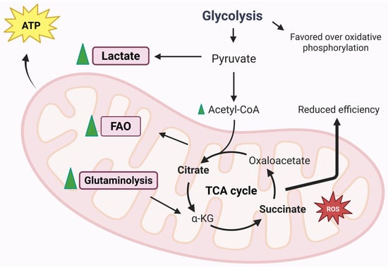 As is widely known, the mitochondrial matrix is the site of TCA. TCA is represented by a series of enzymatic reactions that aim to produce coenzymes with the aim of transporting high-energy electrons in the forms of NADH and FADH2, which are needed to feed the ETC. TCA-derived metabolites participate in micro- and macromolecule biosynthesis, which can have different functions, including signalling roles [78]. These metabolites can contribute to the onset and progression of the disease and can be used as targets for potential therapies. In addition, they can also be used as biomarkers that can provide information on the mechanisms of the disease.