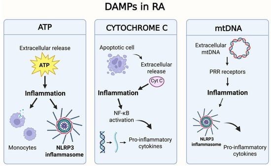 Mitochondria are considered sources of so-called damage-associated molecular patterns (DAMPs). These endogenous molecules serve as signalling pathways for various signals, including tissue injury, cell destruction or cellular stress, and can activate immune cells in a manner similar to microbial pathogen-associated molecular patterns (PAMPs). Mitochondrial components can activate the same pattern-recognition receptors (PRRs) as exogenous PAMPs. Furthermore, DAMPs can signal through several receptors, including Toll-like receptors (TLRs), NOD-like receptors (NLRs), RIG-I-like receptors (RLRs) and purinergic receptors [142]. DAMPs can be released into the cytoplasm when mitochondria are damaged [7] and can bind to their corresponding receptors to elicit an innate immune response (Table 1). There are various types of DAMPs, including high-mobility histone B1, IL-1α and heat shock protein. The inflammatory response by the cells of the innate immune system is not only triggered by the release of DAMPs but also by the presence and release of mtDNA in the extracellular environment, leading to a whole series of consequences that are typical of the physiopathology of the disease [143]. Figure 6 shows the main DAMPs involved in RA.