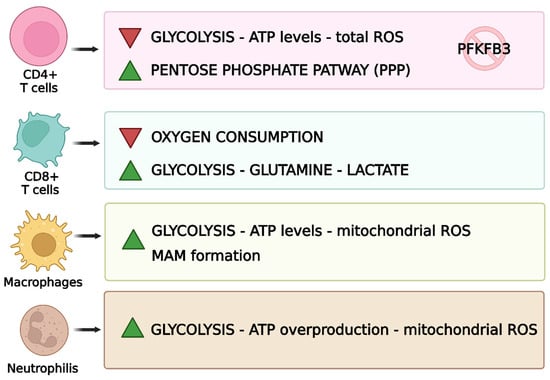 Immune system cells show metabolic abnormalities; in fact, CD4+ T-cells show mitochondrial insufficiency in RA, and low ATP generation and reduced ROS release are evident [178]. Regarding the glycolytic pathway, 6-phosphofuran-2-kinase/fructose-2,6-bisphosphatase 3 (PFKFB3), an enzyme responsible for the production of fructose 2,6-bisphosphate, which contributes to glycolysis, is inhibited during the disease [179]. On the other hand, glucose-6-phosphate dehydrogenase (G6PD), which can catalyse the pentose phosphate pathway (PPP), is upregulated. This phenomenon leads to the excessive production of NADPH and glutathione. These changes cause a reduction in the glycolytic processes and, consequently, ATP production [180]. Reduced amounts of ATP, due to its poor production, negatively affect the TCA cycle. This brings an excess of metabolites such as α-ketoglutarate, citric acid and acetyl-CoA, which affects the metabolism of T-cells and leads to an increase in the motility of this cell type, which leads to an increase in inflammation [181]. In addition, the excessive production of an antioxidant such as glutathione prevents the activation of cell cycle checkpoint kinase ataxia telangiectasia-mutated (ATM) and therefore prevents T-cells from regulating proliferation, favouring inflammatory processes due to excessive and uncontrolled proliferation of Th1 and Th17, worsening the pathological state [182]. In addition, AMPK, one of the proteins responsible for energy metabolism, is activated in physiological conditions when there is a drop in ATP, triggering mitochondrial biogenesis [75]. In RA T-cells, however, this mechanism does not work, and the mitochondria, already compromised, continue to function anyway [180]. CD8+ T-cells also play a role in RA; in fact, in a hypoxic environment and with low glucose concentrations, they increase glutamine uptake, leading to an increase in lactate production [94].