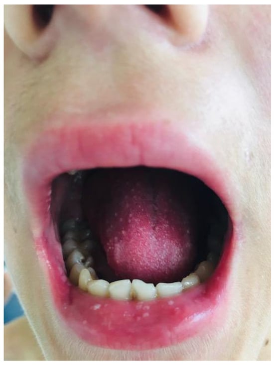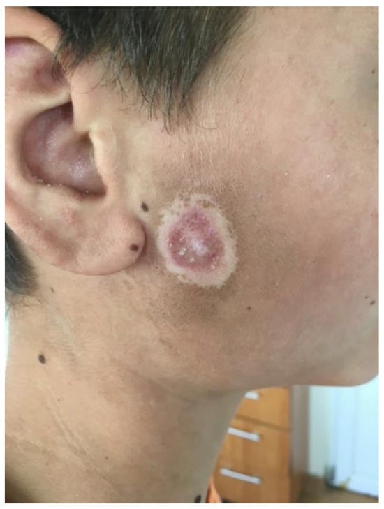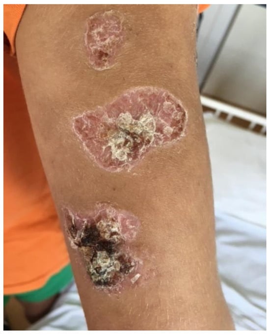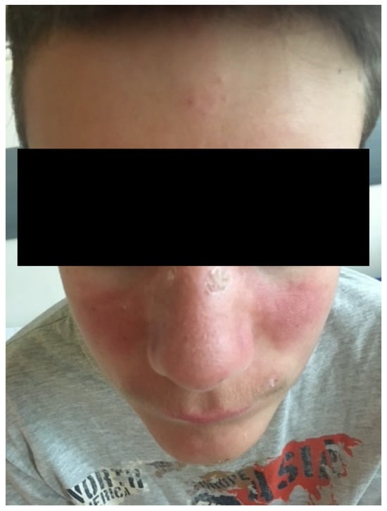 We present the case of a 15-year-old adolescent who was hospitalized in our clinic in June 2021. He came in with ulcerative lesions covered by keratotic crusts on both arms and on the face, which had appeared 3 years before and for which he had had intermittent treatment with oral methylprednisolone. The clinical examination showed BMI of 14.9, facial erythema on the malar prominences and the nasal pyramids (butterfly appearance), ulcerations covered by keratotic crusts on the right cheek, on the angle of the mandible and on both arms, 3/2.5 cm in size, above the epicondyle, erythematous papular elements on the upper lip, erythematous papular elements on the cleavage area and upper limbs—on the hands, in sun-exposed areas, bilateral, mobile, painless laterocervical adenopathies, kyphoscoliosis, petechial rush on the hard palate, mouth ulcers, congestive oropharynx, hypertrophic, and hyperemic tonsils (Figure 1, Figure 2, Figure 3, Figure 4 and Figure 5).