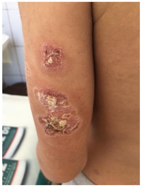 Ulcerations covered by keratotic crusts on both arms, 2/2 cm in size.