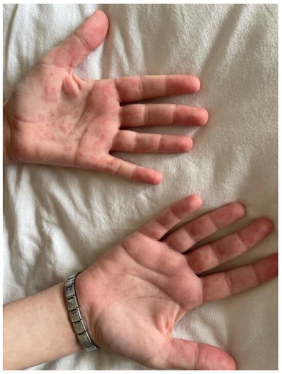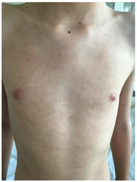 The patient was readmitted after 1 month for high fever, dizziness, asthenia, petechial rashes on his hands and feet, livedo reticularis on the trunk (Figure 6 and Figure 7), and loss of appetite that had started 2 days before. The tests performed showed normochromic anemia (hemoglobin—9.1 g/dL), leucopenia (2.82 × 109/L), elevated acute phase reactants (the CRP level was 42.82 mg/L), later on elevated transaminases (serum glutamic-oxaloacetic transaminase—174 U/L, serum glutamic-pyruvic transaminase—142 U/L), and renal involvement (elevated urea 145 mg/L and creatinine 6.7 mg/L, 24 h proteinuria: 90 mg/24 h).