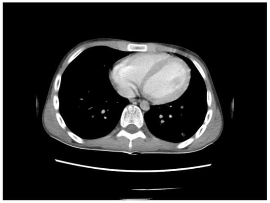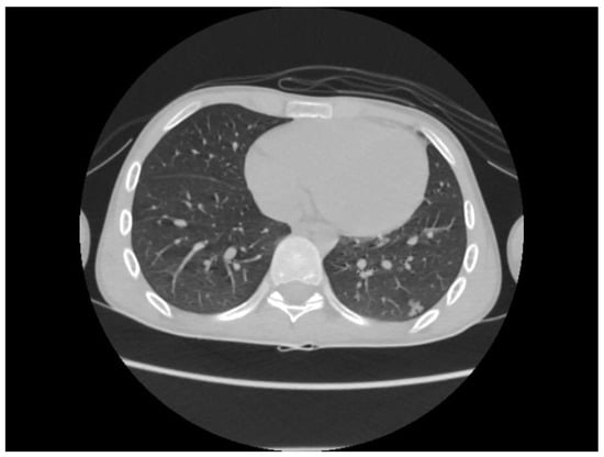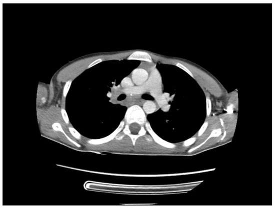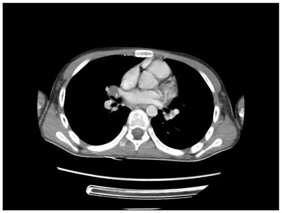 A chest CT scan was performed, which showed bilateral pulmonary micronodules and iodophilic, tissular nodules. Adenopathies: in the paratraheal, paraaortic, and left interlobar areas, a heterogeneous, necrotized, right hilar lymph node block extended below the carina, with microcalcifications inside; pericardial effusion (Figure 8, Figure 9, Figure 10, Figure 11 and Figure 12).