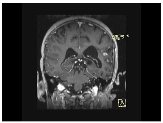 The MRI scan performed 9 months after the initiation of antituberculostatic therapy showed the persistence of changes in the context of left temporo-parieto-frontal encephalitis. The non-evolving appearance of the peripheral annular contrast enhancement, 9/6/6.8 mm in size, was coupled with the appearance of a tuberculoma, situated in the left temporal area. The left parietal sequelae, 4/3.8/7.1 mm and 5.1/3.7/5.3 mm in size, were stable (Figure 13, Figure 14 and Figure 15).