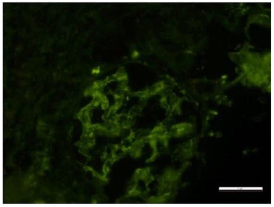 Secondary to the SARS-CoV-2 infection and because of the absence of immunosuppressive treatment during the antituberculostatic treatment, the patient later presented joint pain and renal impairment, objectified by the presence of nephritic-type proteinuria for which a renal biopsy was performed, indicating class III/V lupus nephritis with extracapillary cell proliferation (Figure 16 and Figure 17).
