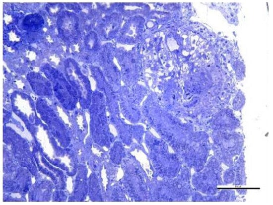Optical microscopy. 14 Semi-fine sections stained with toluidine blue were examined. The content of scale bar is standard.