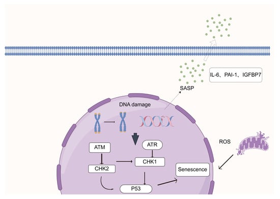 In the intracellular milieu, reactive oxygen species (ROS) can induce DNA damage, perturbing the normal DNA architecture. (As shown in the diagram, ROS acts on the cell to bring about this initial step.) This damage triggers the activation of the ATR (Ataxia Telangiectasia and Rad3-related) protein kinase. The activated ATR then acts on the tumor suppressor protein P53 via downstream signaling cascades involving phosphorylation-dependent molecular relays (matching the pathway where DNA damage activates ATM/ATR, which signal through CHK2/CHK1 to P53 in the diagram). Functioning as a pivotal signaling hub, P53 integrates these inputs to initiate transcriptional programs driving cellular senescence (corresponding to P53 and leading to the “Senescence” outcome in the figure). Additionally, extracellular factors of the senescence-associated secretory phenotype (SASP), including IL-6, PAI-1, and IGFBP7, as depicted, further mediate bidirectional crosstalk between senescent cells and their microenvironment, collectively modulating the senescence cascade (aligning with the SASP being secreted from the cell and interacting with the outside as shown). This figure was created using FigDraw 2.0. Thanks to FigDraw 2.0.