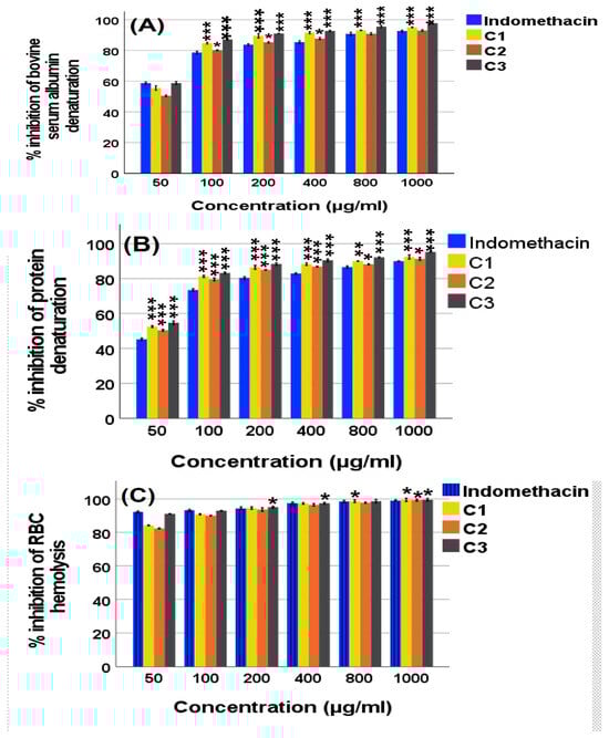 - Esho, B.A.; Samuel, B.; Akinwunmi, K.F.; Oluyemi, W.M. Membrane stabilization and inhibition of protein denaturation as mechanisms of the anti-inflammatory activity of some plant species. Trends Pharm. Sci. 2021, 7, 269–278. [Google Scholar]