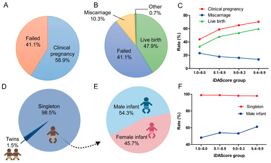 Clinical outcomes of blastocysts in different iDAScore groups. (A) Clinical pregnancy rate of all cycles. (B) Live birth rate of all cycles. (C) Clinical pregnancy, miscarriage, and live birth rates in different iDAScore groups. (D) Singleton rate of all live births. (E) Male infant rate of all live births. (F) Singleton and male infant rates in different iDAScore groups. p < 0.001 for clinical pregnancy, miscarriage, and live birth rates in different iDAScore groups; values were calculated using the Cochrane–Armitage trend test. p > 0.05 for singleton rate, p < 0.001 for male infant rate; values were calculated by chi-square analysis for singleton and male infant rates. (Created with BioRender.com).