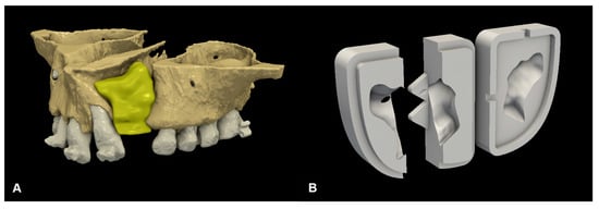 Figure 1. Preoperative virtual planning: (A) digital 3D plan of cleft reconstruction; and (B) CAD-modelled grafting template.