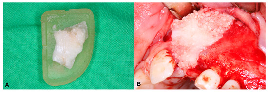Figure 2. Hard-tissue reconstruction of the alveolar cleft: (A) the mixture of fibrin sealant and ATB particles was shaped by the 3D-printed grafting template; and (B) reconstruction of the alveolar defect using the ATB graft.