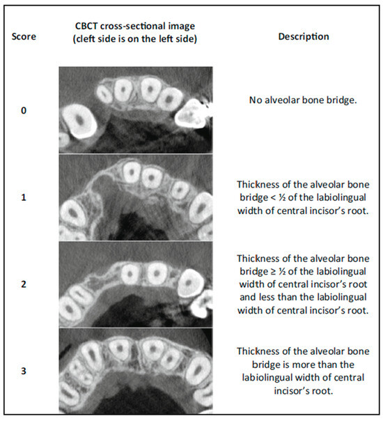 Assessment of the surgical outcomes was performed following the protocol described by Stasiak et al. [22], namely using a CBCT-based qualitative scoring system that is based on the presence and the relative dimensions of the bony bridge between the medial and lateral side of the alveolar cleft in four different vertical positions along the central incisor.