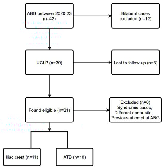 During the period examined, a total of 42 ABG surgeries were performed in our department. In 12 cases, the defect was bilateral; in 30 cases, the defect was unilateral. In 14 cases, an ATB graft was used; in 25 cases, the donor site was the iliac crest; in three cases, the donor site was the chin. Long-term CBCT data was available for 39 patients; three patients were lost to follow-up. Twenty-one participants exhibiting UCLP were found to be eligible and were enrolled in the current study (Figure 4.). Thirteen patients were male, eight were female. Their age at the time of surgery was between 8 and 14 years; the mean age was 10.4 ± 1.7 years. Sixteen defects were located on the left side and five on the right side. In eleven cases, the donor site for the graft was the iliac crest. In the other 10 cases, a total of 53 deciduous teeth and 4 supernumerary teeth were extracted and utilized for the preparation of the ATB graft. In these cases, the patient’s own teeth provided enough material for the proper reconstruction of the alveolar defect, using an average of 5.3 ± 2.26 teeth per patient. The mean follow-up time was 30 ± 13.1 months.