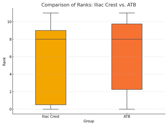 A comparison of the defect volumes between the two groups was performed using an independent sample Student’s t-test. Prior to the analysis, the assumptions for parametric testing were evaluated: Shapiro–Wilk tests confirmed that the volume data were normally distributed in both the iliac crest (p = 0.61) and ATB (p = 0.86) groups, and Levene’s test indicated the homogeneity of the variances (p = 0.36). The t-test revealed no statistically significant difference in the mean defect volume between the iliac crest group and the ATB group (t(df) = −1.48, p = 0.155).