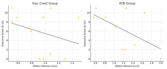 The correlation between the bone defect volume and the outcome score was analyzed separately for the iliac crest and ATB groups, using Spearman’s rank correlation. In the iliac crest group, a weak negative correlation was observed (ρ = −0.19, p = 0.58), while the ATB group showed a moderate negative correlation (ρ = −0.36, p = 0.31). However, neither correlation reached statistical significance (p > 0.05). Scatter plots with trendlines are used to illustrate the inverse relationship between the defect volume and outcome score in both groups (Figure 7).