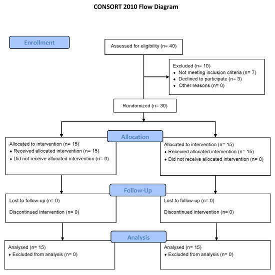 Participants were recruited from Policlínica Santa María Clinic. The random sequence for allocation to treatment groups was generated by an independent researcher and was concealed in sequentially numbered envelopes. The randomized sequence was designed to ensure balanced groups based on the number of participants assigned. The sample size was calculated using a random allocation software program (Epidat 4.2) (Servicio de Epidemiología de la Dirección Xeral de Saúde Pública da Consellería de Sanidade, Xunta de Galicia, Santiago de Compostela, Spain) based on data by Lauche et al. [35] to detect statistically significant differences in pain intensity using NPRS, with 80% statistical power and 95% confidence level. Therefore, it was determined that a minimum sample size of 15 participants per group was required for conducting a study of this nature. Data collection was conducted by a physician who was blinded as to which participants received tDCS or TENS intervention. A total of 30 participants was included in the present study, with 60% of the sample being female, and a mean age of 36,7 years (SD = 9,9); 15 participants were assigned to the intervention group (IG = 15) and 15 to the control group (CG = 15). Table 1 displays the baseline morphological and clinical characteristics of the sample. The baseline comparability analysis revealed no statistically significant differences between the intervention and control groups in most variables. The only exception was cervical extension, which showed a significant difference between groups (p = 0.004).