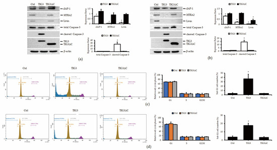 Since cIAP-1, HTRA2, and Survivin suppressed TIG3-induced Caspase-3 activation, we examined whether they also affect the TIG3-induced accumulation of sub-G1 cells. As shown in Figure 5a, the expression of cIAP-1, HTRA2, or Survivin in A2058 cells significantly reduced the TIG3-induced increase in sub-G1 cell populations. Notably, the co-expression of TIG3 with either cIAP-1 or Survivin restored the sub-G1 population to baseline levels. A similar reduction was observed in A375 cells’ co-expression of TIG3 with either cIAP-1 or Survivin (Figure 5b).