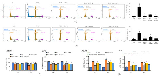 Cell viability and death were assessed as described in prior studies [11,16]. Briefly, A2058 or A375 cells (2 × 104 cells per well) were seeded in triplicate in 24-well plates, before being incubated for 24 h at 37 °C in media containing 10% fetal bovine serum (FBS; Gibco, Thermo Fisher Scientific, Waltham, MA, USA). After transfection with either an empty vector, the TIG3-myc-his expression vector, or the TIG3ΔC-myc-his expression vector—or co-transfection with TIG3-myc-his and cIAP-1-Flag, HTRA2-Flag, or EGFP-Survivin expression vectors—the media were replaced after 6 h with fresh 10% FBS-containing media, before being incubated overnight. The next day, the media were replaced with 1% FBS-containing media, and cells were cultured for an additional 24–48 h.