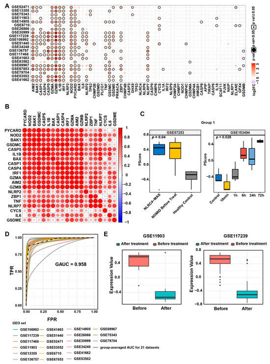 Association of pyroptosis with psoriasis and development/validation of the pyroptosis score. (A) Dot plot showing the expression differences of pyroptosis-related genes between psoriasis and normal controls across bulk-RNA datasets. (B) Dot plot illustrating the expression patterns of 20 pyroptosis-related genes in the dataset, as determined by the non-negative matrix factorization (NMF) algorithm. (C) Boxplot validating the pyroptosis score in the pyroptosis-related datasets GSE57253 and GSE153494. (D) Average ROC curve evaluating the discriminatory power of the pyroptosis score in psoriasis. (E) Boxplot demonstrating changes in the pyroptosis score before and after treatment.