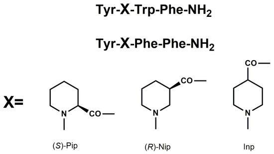 Endogenous and naturally occurring opioid peptides may serve as important leads for the design of peptide analogs with better pharmacodynamic and pharmacokinetic properties. Previously, we have described synthesis, together with biological evaluation of EM analogs, modified in position 2 by incorporation of unnatural amino acids with six-membered heterocyclic rings, such as piperidine-2-, 3-, and 4-carboxylic acids ((S)-Pip, (R)-Nip, and Inp, respectively) (Figure 1) [18,19,20].