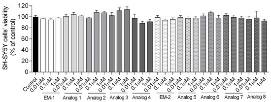Taking into account the satisfactory biological activity of the obtained EM analogs, we decided to check their neuroprotective profile. To explore this effect, we used a CORT-induced in vitro model of depression using SH-SY5Y cells. Additionally, we proposed an anti-inflammatory study by assessing the ability to reduce nitric oxide (NO), tumor necrosis factor alpha (TNF-α), and interleukin 6 (IL-6) production in macrophage RAW 264.7 cells damaged by lipopolysaccharide (LPS) and interferon gamma (IFN-γ).