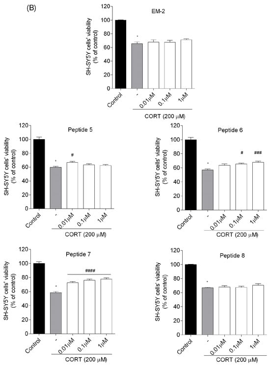 Effects of (A) EM-1 analogs, and (B) EM-2 analogs on the viability of CORT-injured SH-SY5Y cells. Neuroblastoma cells were exposed to peptides (0.01–1 µM) and CORT (200 µM) for 24 h. Cell viability was measured by MTT assay. All the data were presented as mean ± SEM of three–four independent experiments. The statistically significant changes are indicated by asterisks (ANOVA, Dunnett’s test): * p < 0.0001 as compared to control, and # p < 0.05, ## p < 0.01, ### p < 0.001, #### p < 0.0001 as compared to CORT-treated cells.