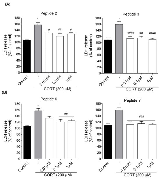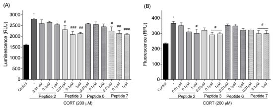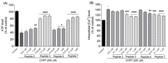 Effects of peptides on (A) ATP level and (B) the intracellular [Ca2+]i level. Neuroblastoma cells were exposed to peptides 2, 3, 6, and 7 (0.01–1 µM) and CORT (200 µM) for 24 h. All the data were presented as mean ± SEM of three independent experiments. The statistically significant changes are indicated by asterisks (ANOVA, Dunnett’s test): * p < 0.0001 as compared to control, and # p < 0.05, ## p < 0.01, ### p < 0.001, #### p < 0.0001 as compared to CORT-treated cells.