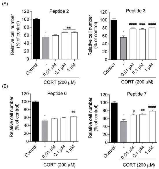 To further confirm the effects of peptides on cell viability in the CORT-treated cells, the trypan blue exclusion assay was used to determine the number of viable/live cells. Again, we confirmed that treatment of cells with CORT causes a minor decrease in cell viability following 24 h incubation (Figure 6). The relative number of cells did not fall below 50% and remained in the range of 52–57% in any experimental series as compared to the control (p < 0.0001). In contrast, incubation with peptides 2, 3, 6, and 7 increased the relative cell number (Figure 6). Peptides 3 (the number of cells maintained at around 78–80% for the dose of 0.01 and 1 µM, p < 0.0001, and around 76% for the dose of 0.1 µM, p < 0.001) and 7 (~78% for the dose of 1 µM, p < 0.0001) exerted their most protection potential against CORT-induced injury, ameliorating its toxic effects.