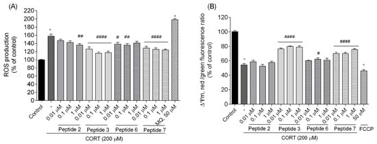 Effects of peptides on (A) intracellular ROS generation and (B) ΔΨm measurement. Neuroblastoma cells were exposed to peptides 2, 3, 6, and 7 (0.01–1 µM) and CORT (200 µM) for 24 h. In the ROS experiment, menadione (MQ, 50 µM) was used as a positive control. In the ΔΨm measurement, carbonylcyanide-p-trifluoromethoxyphenylhydrazone (FCCP, 50 µM) was used as a positive control. ΔΨm was expressed as a ratio of red (λex = 540/λem = 590 nm) to green (λex = 490/λem = 525 nm) fluorescence. All the data were presented as mean ± SEM of three independent experiments. The statistically significant changes are indicated by asterisks (ANOVA, Dunnett’s test): * p < 0.0001 as compared to control, and # p < 0.05, ## p < 0.01, #### p < 0.0001 as compared to CORT-treated cells.