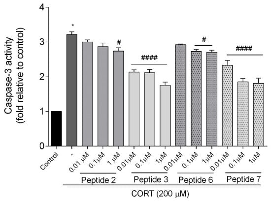 Effect of peptides on caspase-3 activity. Neuroblastoma cells were exposed to peptides 2, 3, 6, and 7 (0.01–1 µM) and CORT (200 µM) for 24 h. All the data were presented as mean ± SEM of four independent experiments. The statistically significant changes are indicated by asterisks (ANOVA, Dunnett’s test): * p < 0.0001 as compared to control, and # p < 0.05, #### p < 0.0001 as compared to CORT-treated cells.