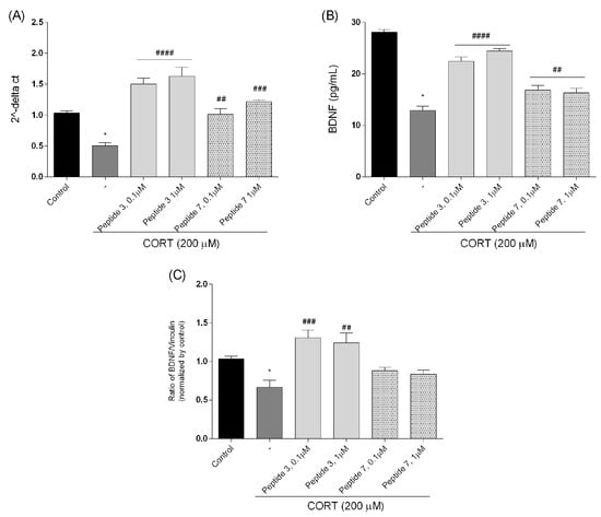 Analysis of BDNF expression at gene and protein levels, where (A) BDNF mRNA expression levels were measured by qPCR, (B) BDNF protein concentration was determined by ELISA, and (C) BDNF protein expression estimated by Western blot analysis. Neuroblastoma cells were exposed to peptides 3 or 7 (0.1 and 1 µM) and CORT (200 µM) for 24 h. Expression was analyzed by qPCR, relatively compared to their respective untreated controls. The expression levels of the target gene were estimated by the method after normalizing to the expression level of GAPDH. Cell lysates (20 μg protein) were analyzed for BDNF (12 kDa) activation by Western blotting using a specific BDNF antibody. The level was quantified by densitometry, and the data were normalized to values obtained from vehicle cells. All the data were presented as mean ± SEM of three independent experiments. The statistically significant changes are donated by asterisks (ANOVA, Dunnett’s test): * p < 0.0001 as compared to control, and ## p < 0.01, ### p < 0.001, #### p < 0.0001 as compared to CORT-treated cells.