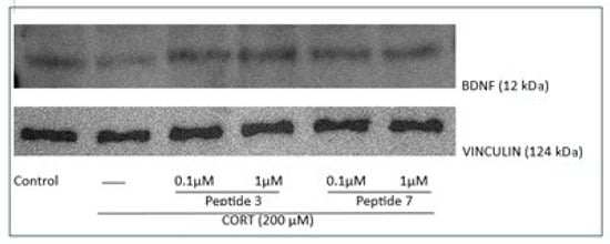 Representative Western blot bands for BDNF and loading control (vinculin) after stimulation by peptides 3 and 7 (0.1 and 1 μM) in CORT-treated SH-SY5Y cells. Cell lysates (20 μg protein) were analyzed for BDNF (12 kDa) activation by Western blotting using a specific BDNF antibody. The level was quantified by densitometry, and the data were normalized to values obtained from vehicle cells.