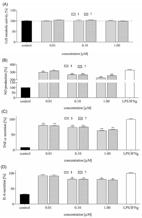 Among the studied peptides, 3 and 7 revealed the highest neuroprotective potential. First, their effect on metabolic activity was determined. As presented in Figure 15A, both compounds at concentrations 0.01–1 µM had no statistically significant effect on the metabolic activity of cells. Next, the compounds’ modulatory effect on the secretion of pro-inflammatory mediators in RAW 264.7 was studied.