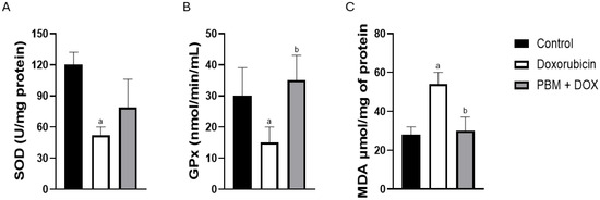 Furthermore, the activity of antioxidant enzymes was evaluated across all experimental groups. After exposure to DOX, the activity of superoxide dismutase (SOD) decreased; however, PBM irradiation had no effect compared to the other experimental groups (Figure 4A). Moreover, glutathione peroxidase (GPx) activity decreased after DOX exposure, and a significant increase was observed following PBM preconditioning (Figure 4B). Interestingly, DOX treatment increased malondialdehyde (MDA) levels, while PBM significantly reduced MDA (Figure 4C).