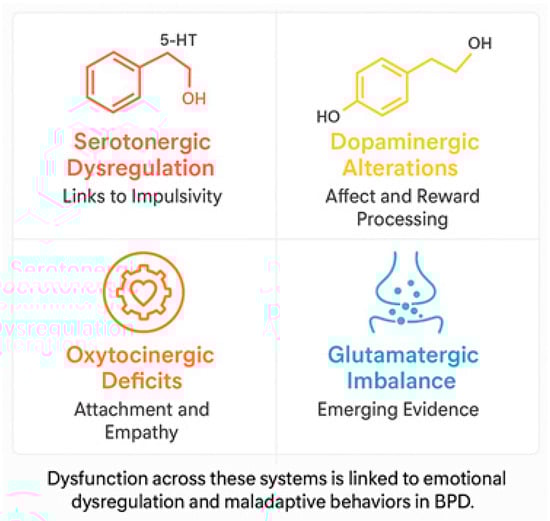 - Dopamine (DA): Dysfunctions in the dopaminergic system have been associated with disturbances in reward processing, emotional regulation, and impulsivity. Neuroimaging studies have revealed alterations in mesolimbic circuitry and decreased dopamine receptor binding in the striatum, which are linked to heightened emotional sensitivity and impaired regulation of negative emotions [36,37].