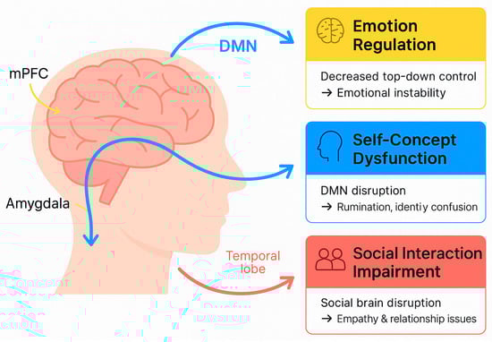 | Functional connectivity | PFC–amygdala, DMN, mentalizing networks | Poor emotion regulation, self-disturbance, social cognition deficits | [11,29] |