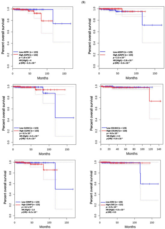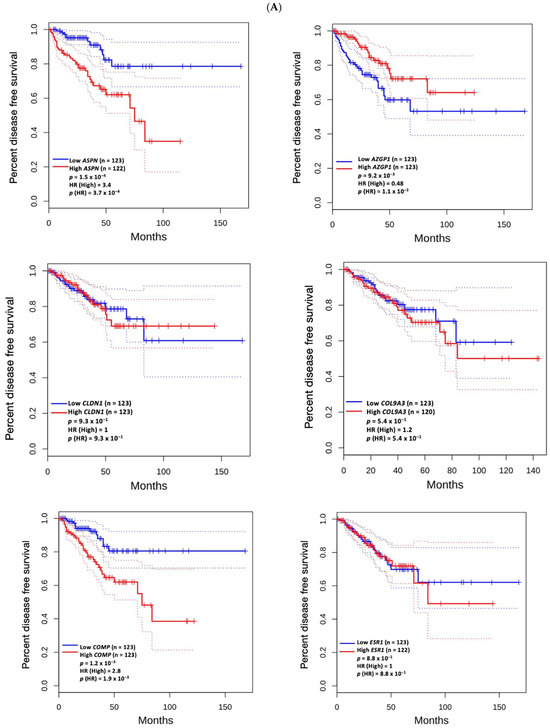 Among the identified hub genes, high mRNA expression of AZGP1 was associated with longer disease-free survival (p = 9.2 × 10−3). In contrast, elevated expression levels of ASPN (p = 1.5 × 10−4), COMP (p = 1.2 × 10−3), RYR2 (p = 1.2 × 10−2), and SFRP4 (p = 1.6 × 10−2) were significantly associated with shorter disease-free survival (Figure 4A). No significant association was observed between the expression levels of these hub genes and overall survival (Figure 4B).