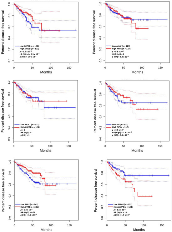 Kaplan–Meier analysis of disease-free survival (A) and overall survival (B) based on mRNA expression levels of hub genes. Patients were stratified into high- and low-expression cohorts. Red and blue curves represent the high- and low-expression groups, respectively. Solid lines indicate survival estimates; dotted lines represent 95% confidence intervals. The p-value reflects the statistical significance of the difference in survival curves between the two groups, as determined by the log-rank test. The hazard ratio (HR) represents the relative risk of an event occurring in the high-expression group compared to the low-expression group, and p(HR) indicates the statistical significance of this estimate based on the Cox proportional hazards model. A p-value < 0.05 was considered statistically significant for both tests.