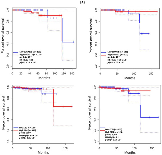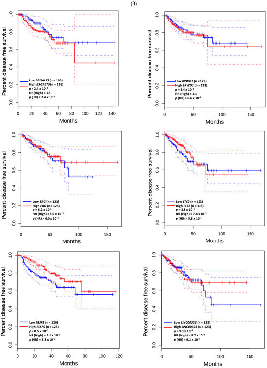 Kaplan–Meier analysis of overall survival (A) and disease-free survival (B) based on mRNA expression levels of genes with frequent genetic alterations. Patients were stratified into high- and low-expression cohorts. Red and blue curves represent the high- and low-expression groups, respectively. Solid lines indicate survival estimates; dotted lines represent 95% confidence intervals. The p-value reflects the statistical significance of the difference in survival curves between the groups, as assessed by the log-rank test. The hazard ratio (HR) represents the relative risk of an event occurring in the high-expression group, and p(HR) indicates the significance of this estimate from the Cox proportional hazards model. A p-value < 0.05 was considered statistically significant for both tests.