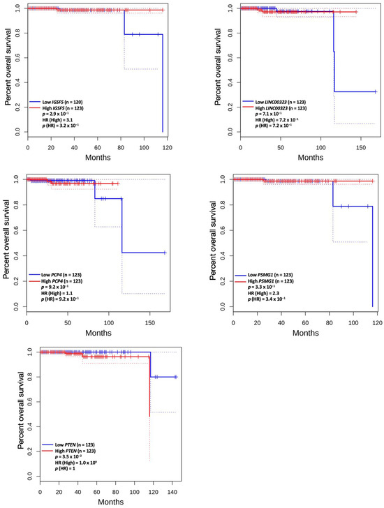 Among the genes with genetic alterations, only PTEN showed prognostic significance, with high expression levels associated with shorter overall survival (p = 3.5 × 10−2; Figure 5A). However, for these genes, no significant associations were found with disease-free survival (Figure 5B).