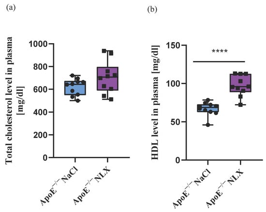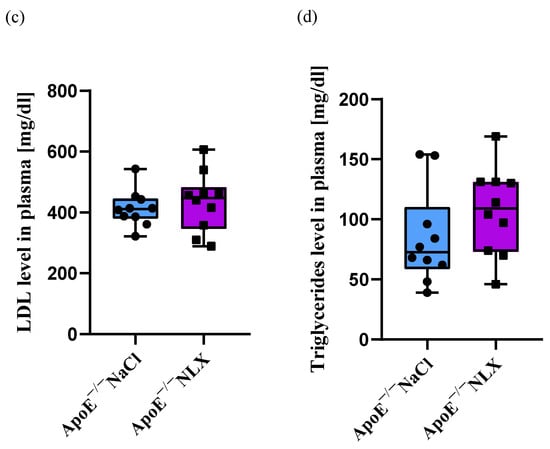 Lipid profile in plasma: (a) total cholesterol, (b) HDL, (c) LDL, (d) triglyceride levels in response to administration of NLX in ApoE−/− mice (n = 10 per group) **** p < 0.0001 (HDL: high-density lipoprotein; LDL: low-density lipoprotein).